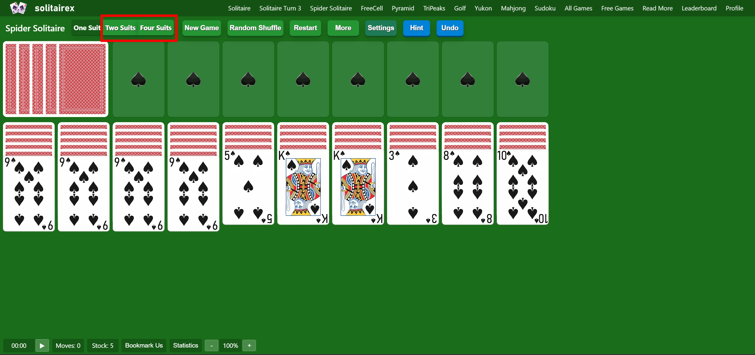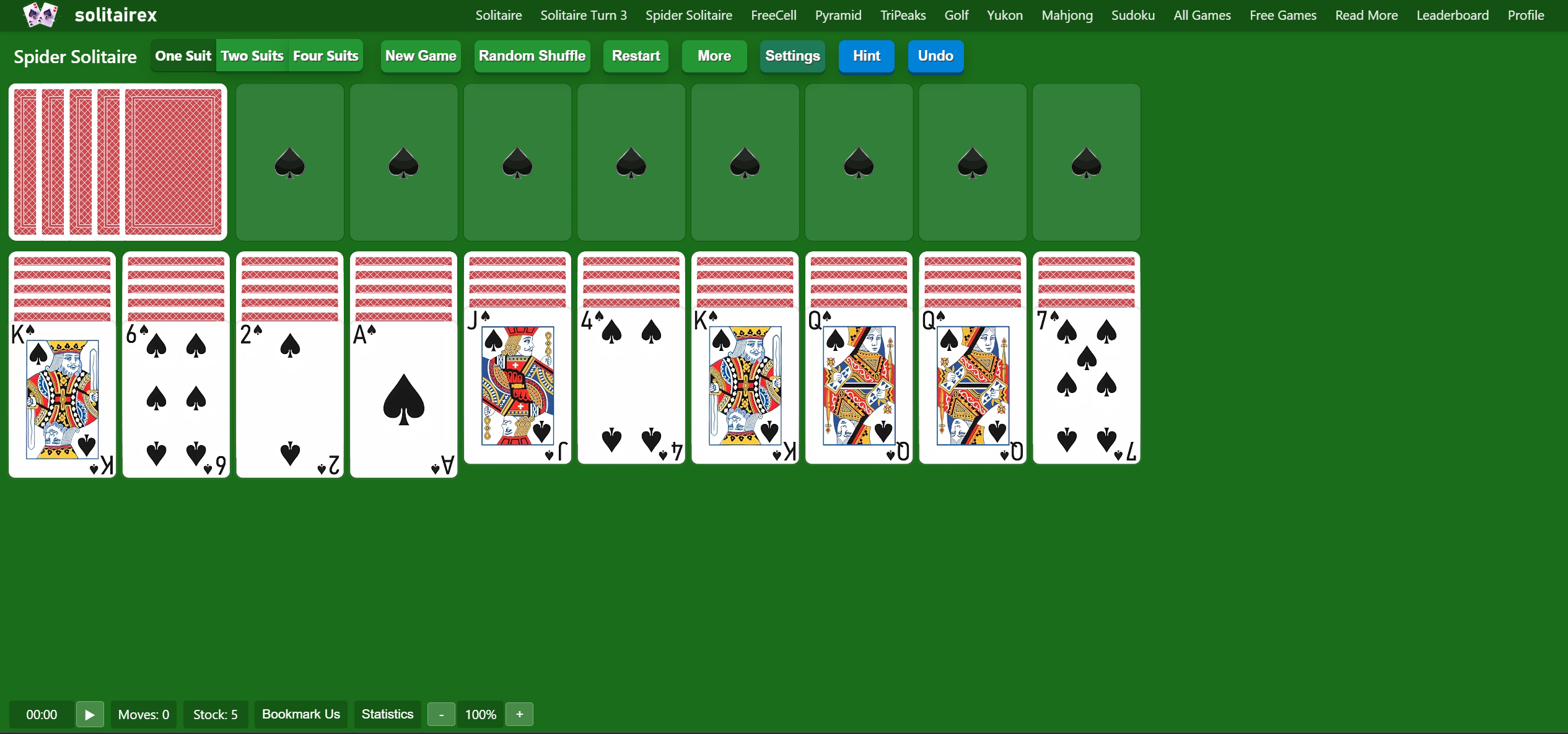 Spider Solitaire is often considered one of the most engaging and difficult variations of Solitaire. Played with two standard 52-card decks (for a total of 104 cards), the game challenges players to create descending sequences of cards (from King down to Ace) in the same suit. Once a complete sequence is formed, it’s removed from the table. The ultimate goal is to remove all cards, clearing the board entirely.
